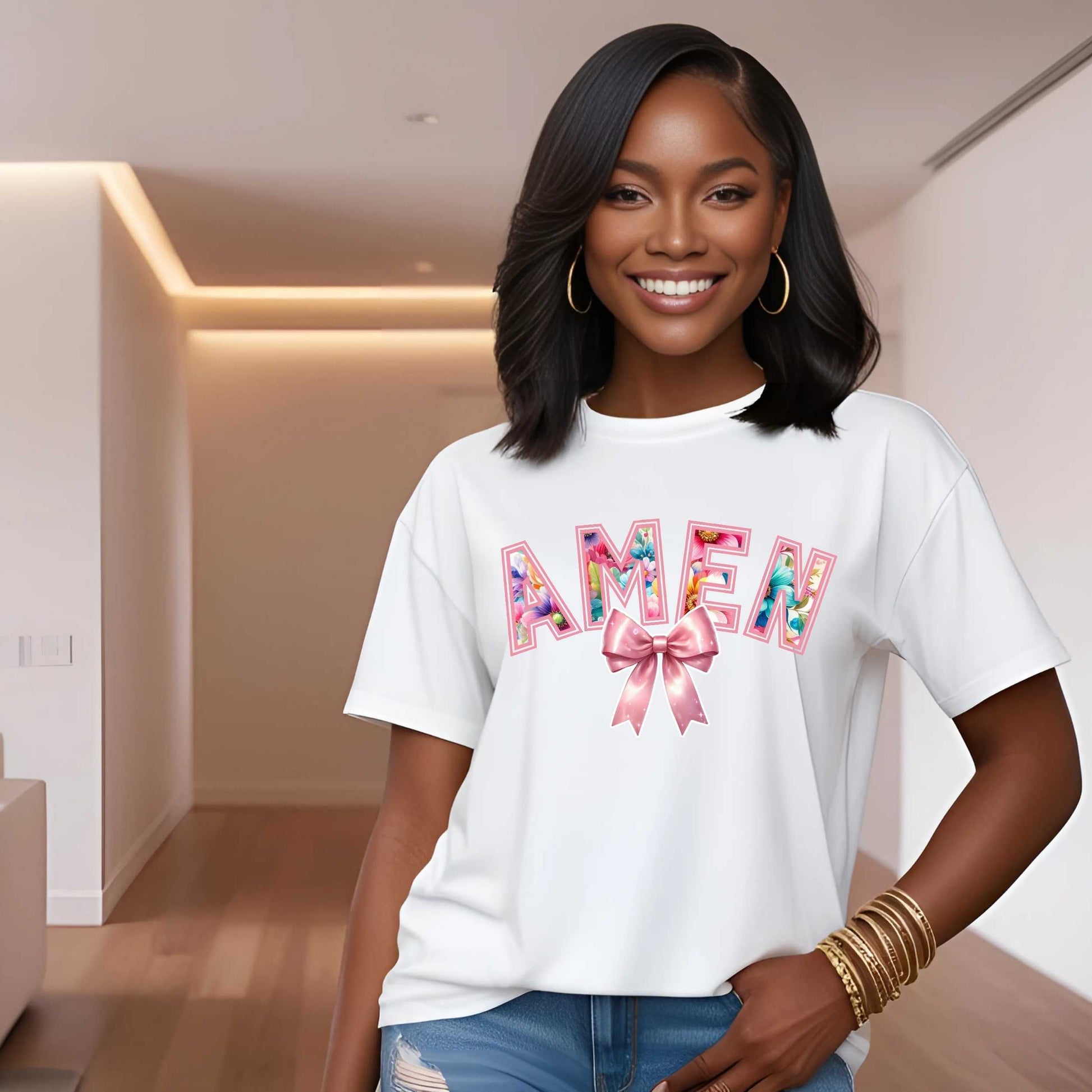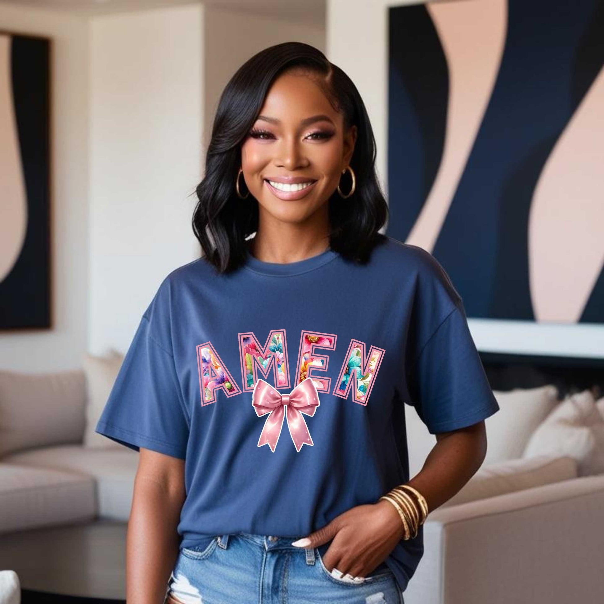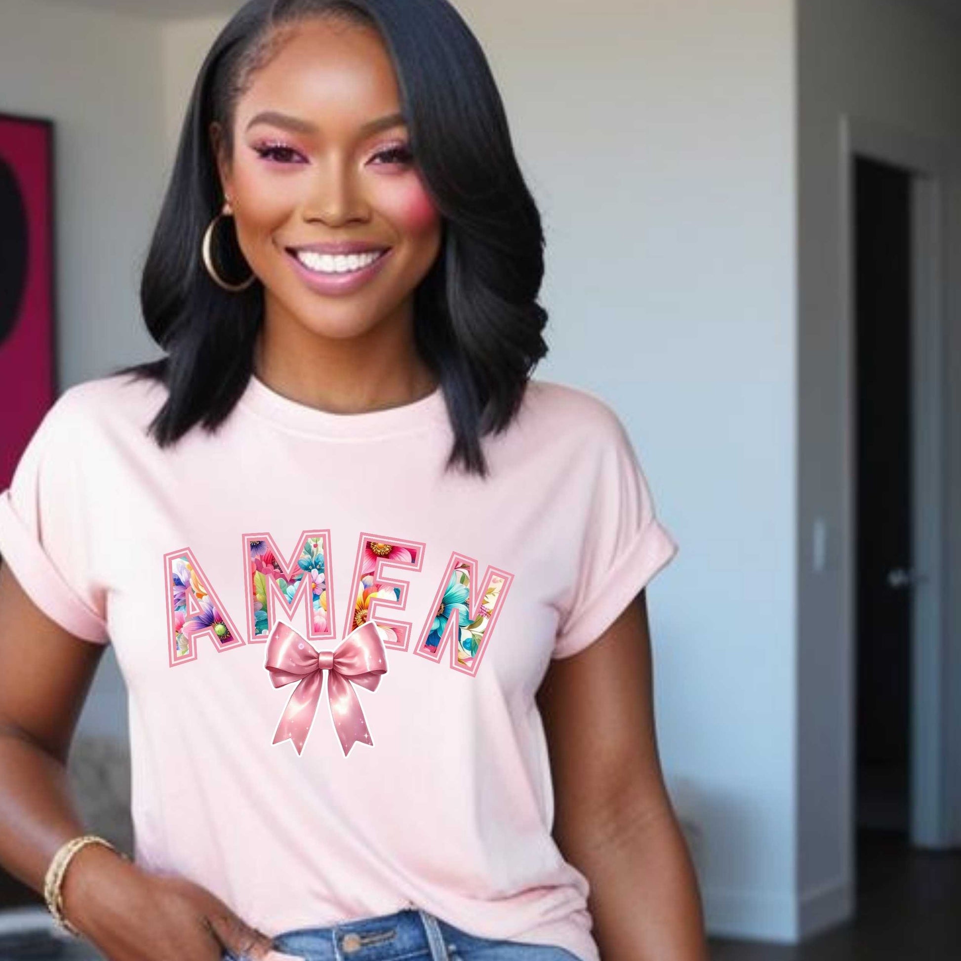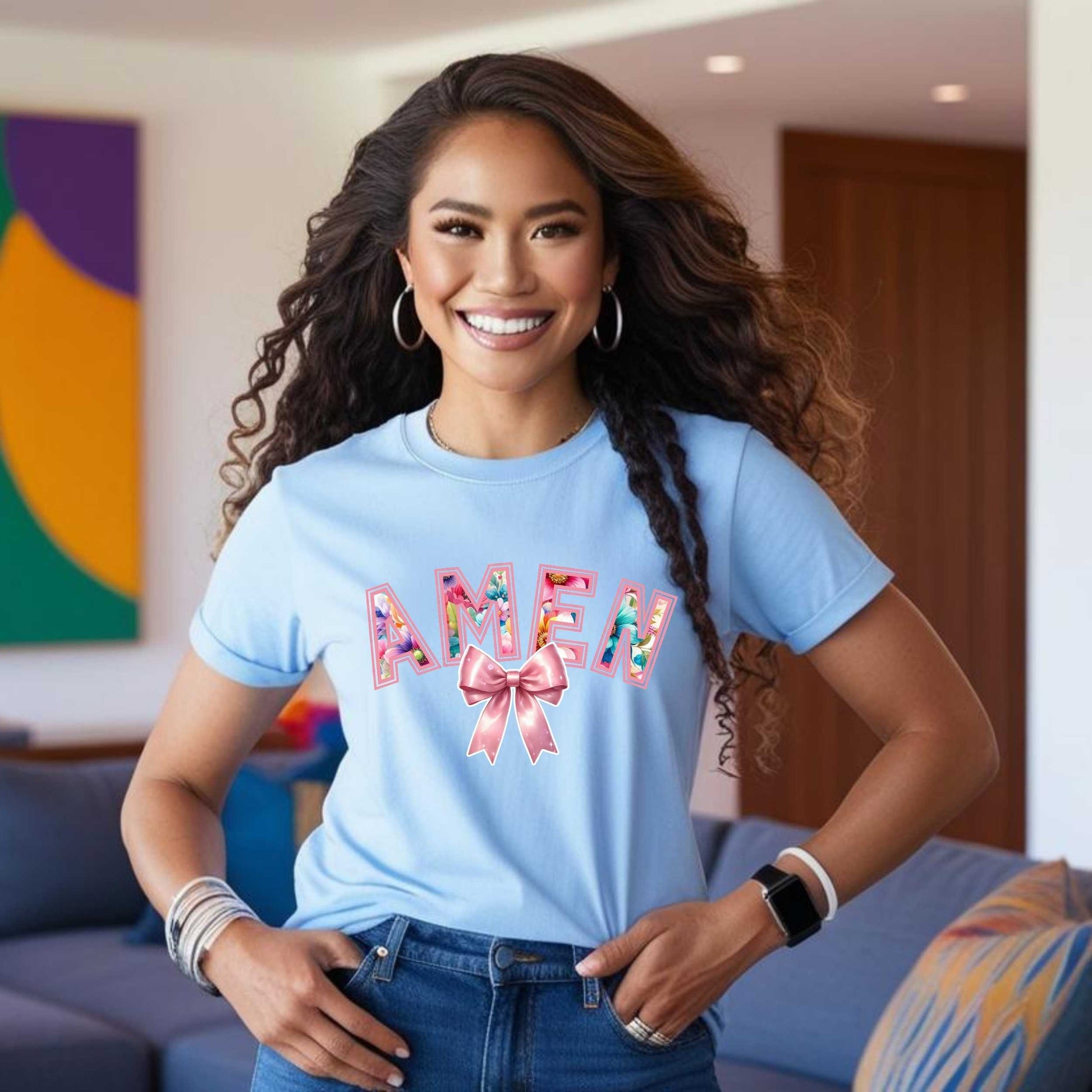 Amen Floral Christian T-Shirt – Faith-Based Graphic Tee for Women Celebrate faith in style with this Amen religious t-shirt, featuring a beautiful floral print design and a feminine bow accent. Perfect for those who love to express their faith with a touch of elegance, this Christian graphic tee makes a meaningful addition to any wardrobe. Features: Faith-Inspired Design – Bold "AMEN" lettering filled with vibrant floral patterns, symbolizing grace and renewal.