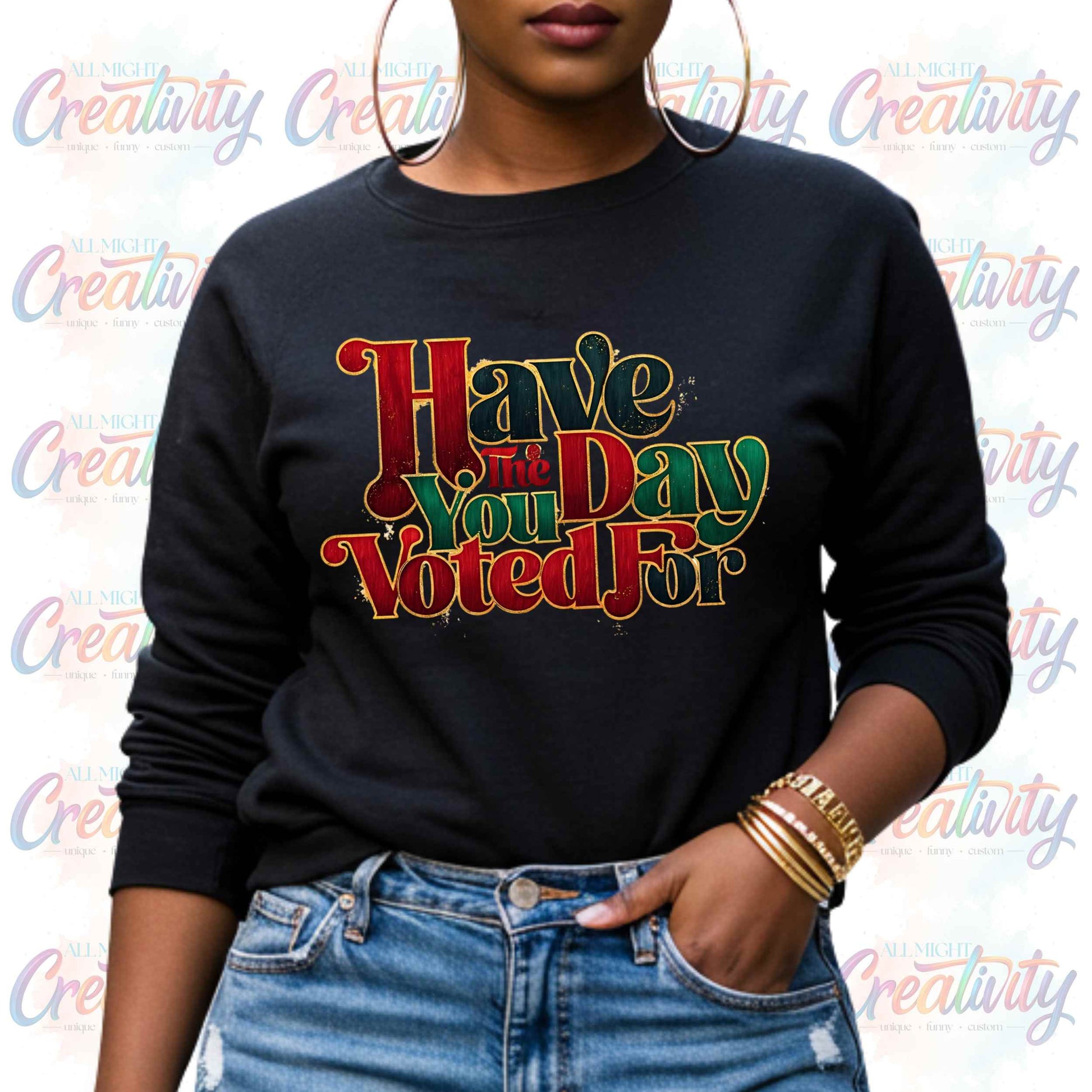 This bold Black History Month and Juneteenth sweatshirt says what everyone’s thinking: “Have the day you voted for”—and we mean that with soul. Whether you're side-eyeing politics or celebrating the power of the vote, this Gildan 18000 sweatshirt is a walking mic drop. Perfect for Juneteenth, Black History Month, or any day you feel like rocking a little truth with your comfort. The retro bold text design pops in vibrant red, green, and black—giving nods to freedom, resistance, and Black-owned shops everywhere. This black history shirt is more than a vibe—it’s a whole statement. Wear it to protest, brunch, the grocery store, or your next awkward family gathering. It also pairs well with your favorite sneakers and a side of unbothered energy. If you’re celebrating Juneteenth, bold black woman designs, or just looking for the next great social justice shirt that sparks conversation, this one’s got you covered.