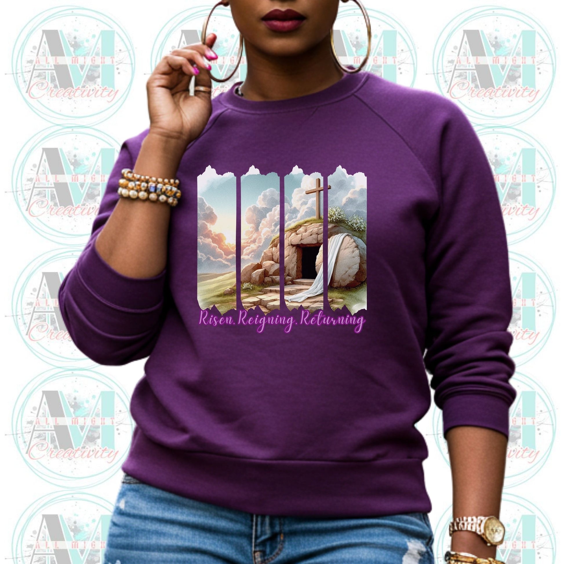 Celebrate the hope and victory of the Resurrection with this beautifully designed Risen. Resurrected. Returning. Christian sweatshirt. Featuring an empty tomb, radiant skies, and a cross standing in glory, this faith-inspired design honors the resurrection of Jesus Christ and the promise of His return. Perfect for church services, Bible study, or everyday encouragement, this sweatshirt is a must-have for any woman of faith who wants to wear her belief boldly and beautifully.