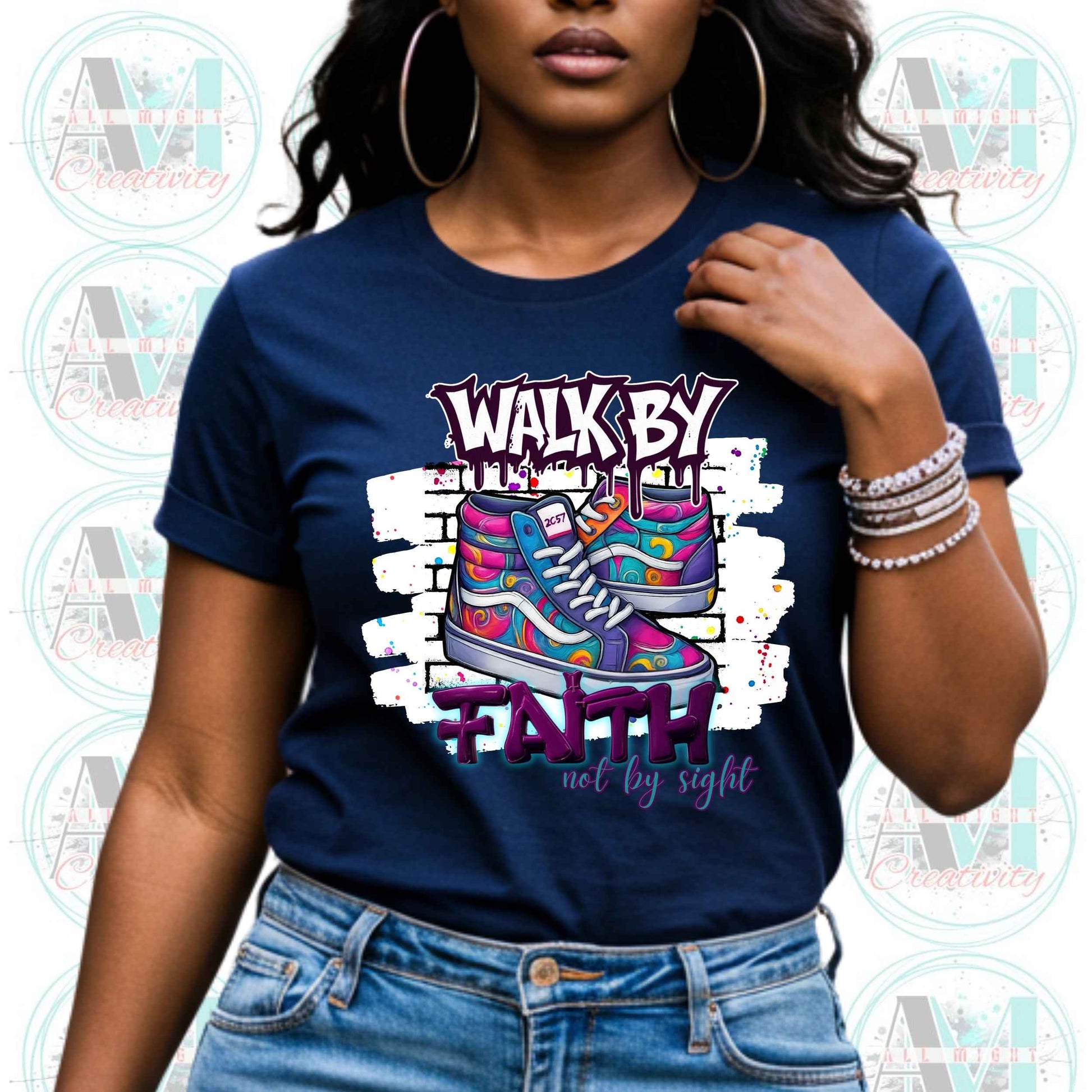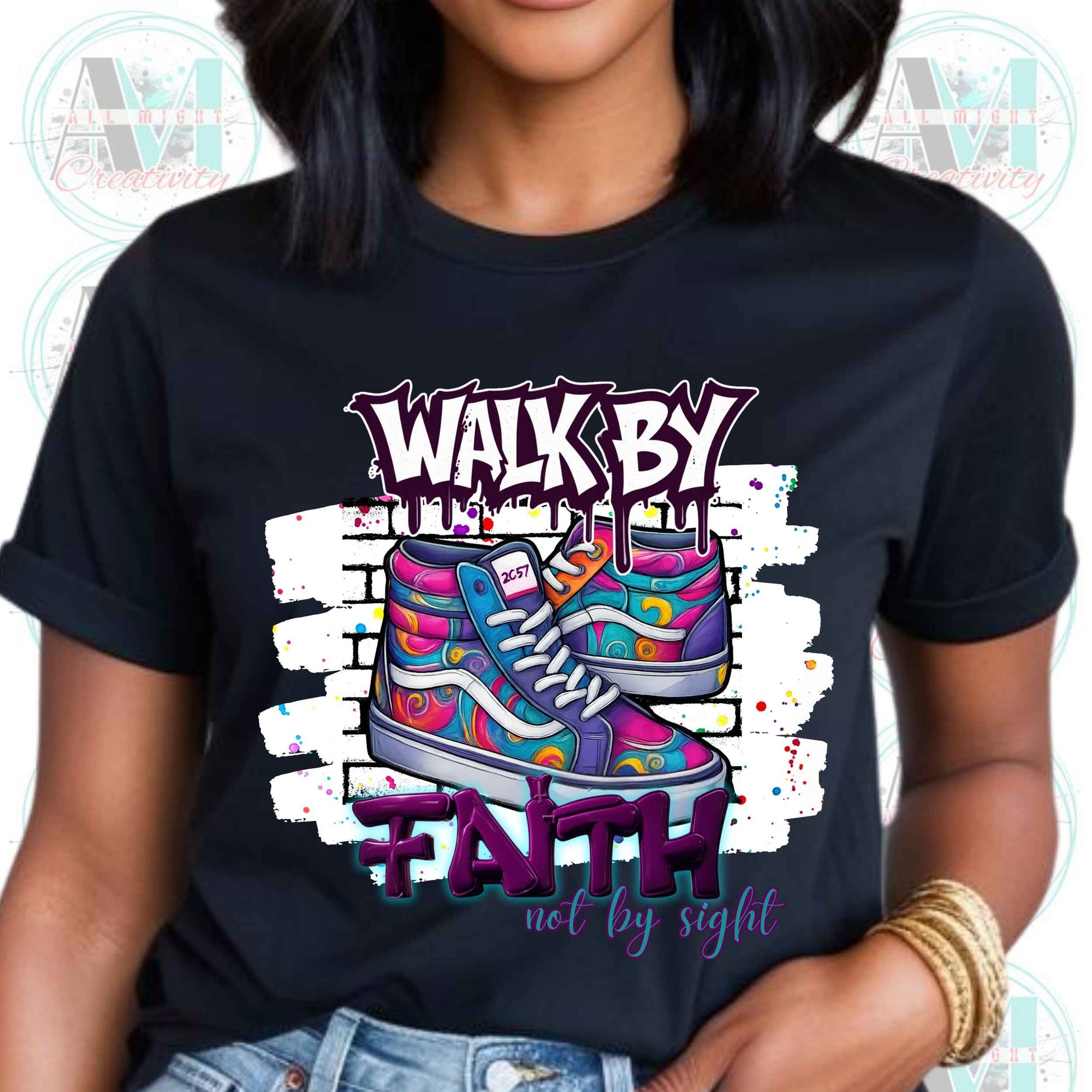 Make a bold statement of faith and fashion with this eye-catching “Walk by Faith, Not by Sight” Christian t-shirt. Featuring a vibrant, graffiti-style design with a colorful pair of sneakers, this shirt is a reminder to stay grounded in your spiritual journey. The design includes a subtle nod to 2 Corinthians 5:7—"For we walk by faith, not by sight"—printed on the tongue of the sneaker, adding depth and meaning to this empowering tee.