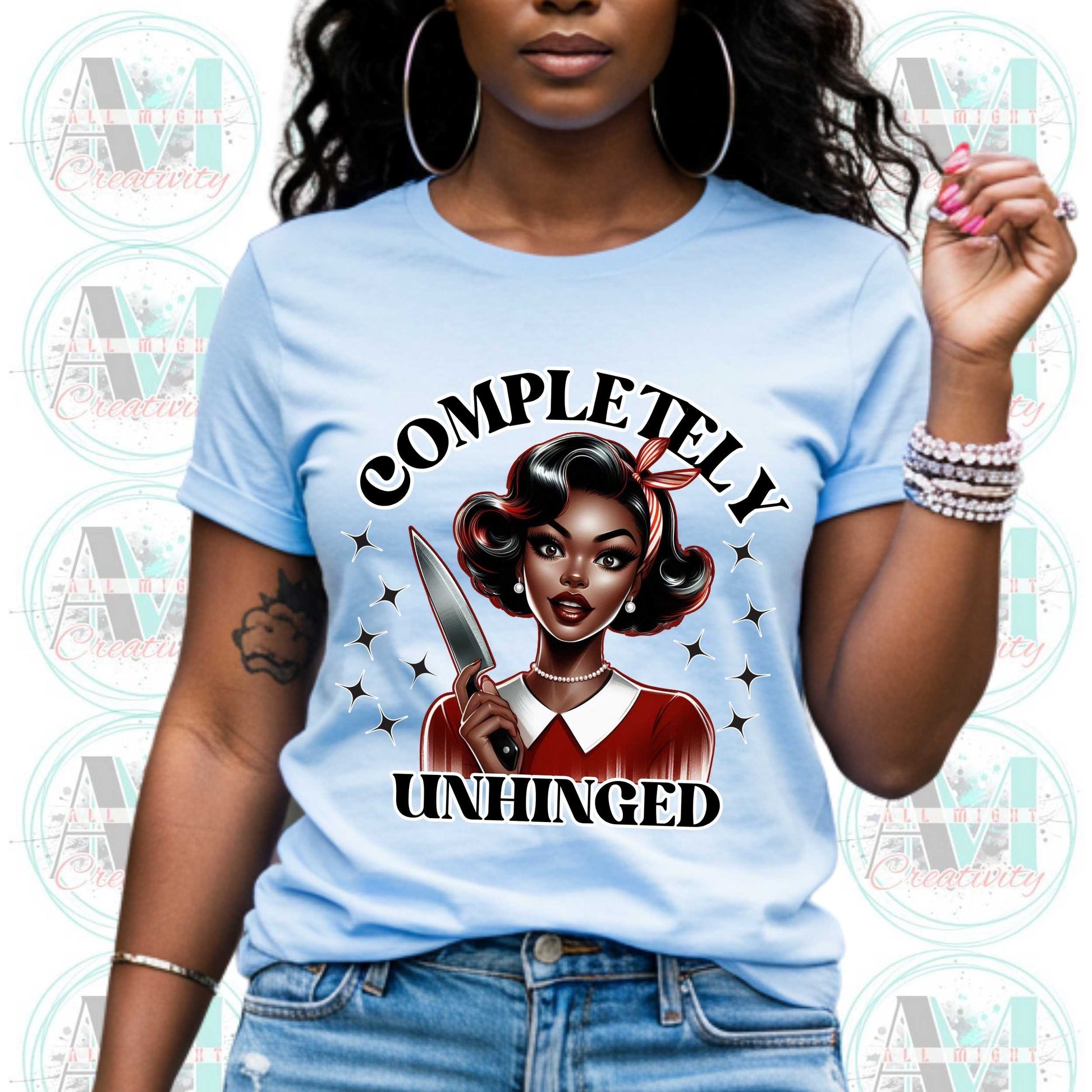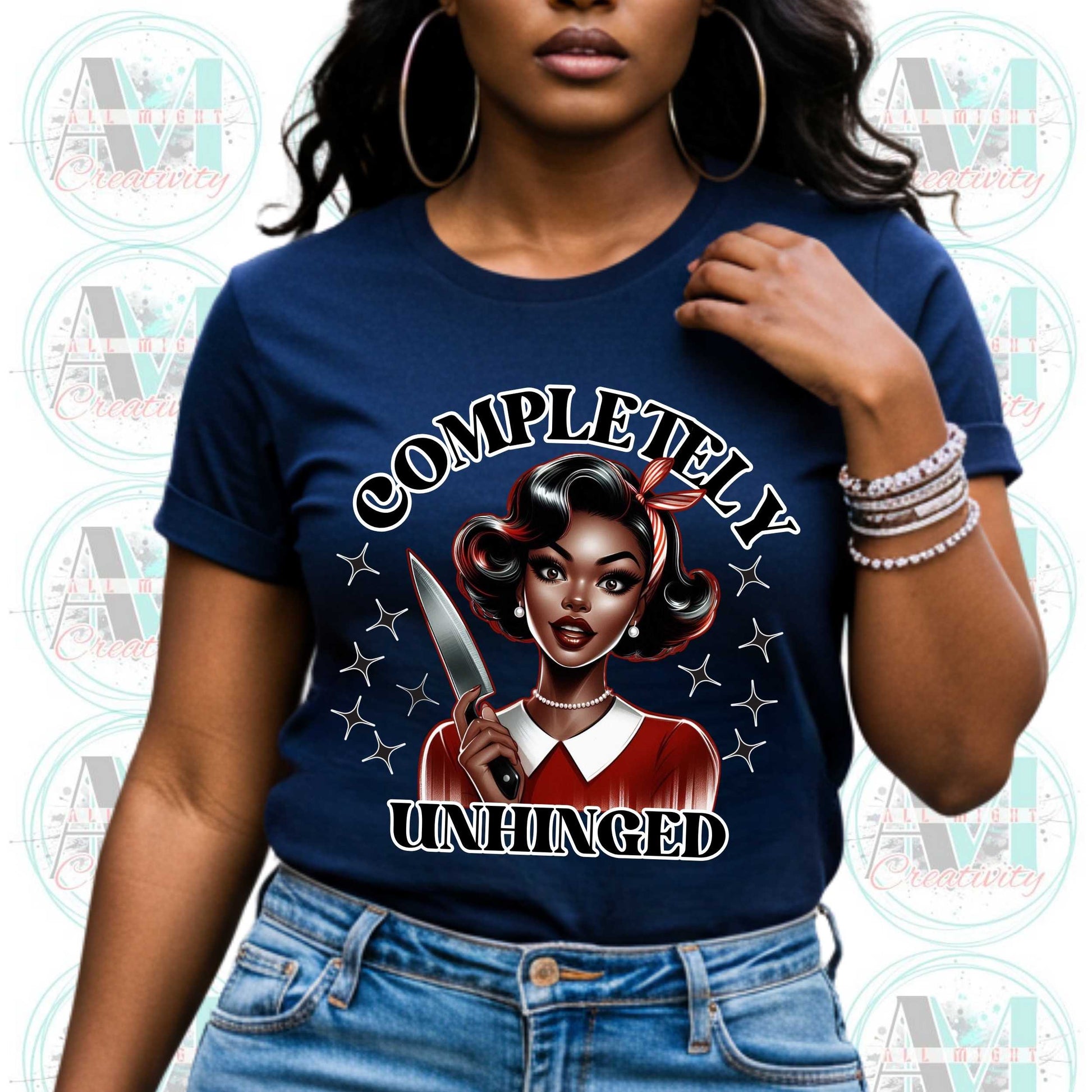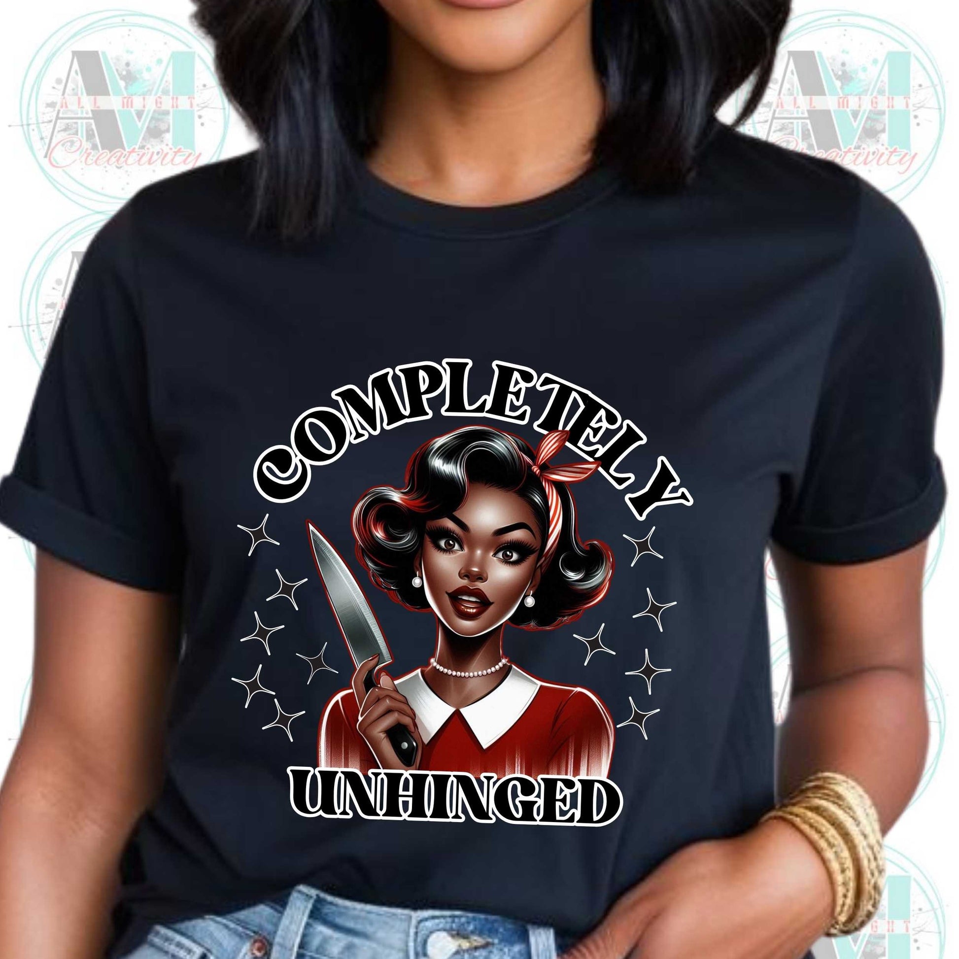 Serve retro glam and violent vibes with this Completely Unhinged tee—because smiling sweetly while holding a knife is a whole mood. This funny shirt is for the women who skipped the “calm down” era and went straight to “I said what I said.” Perfect for your sarcastic collection of edgy joke shirts and funny meme shirts, this inappropriate shirt lets everyone know you’re one minor inconvenience away from starring in your own true crime special. Great for work (if HR's brave), brunch, or passive-aggressive errands. Because some days, “unbothered” just doesn’t cut it.