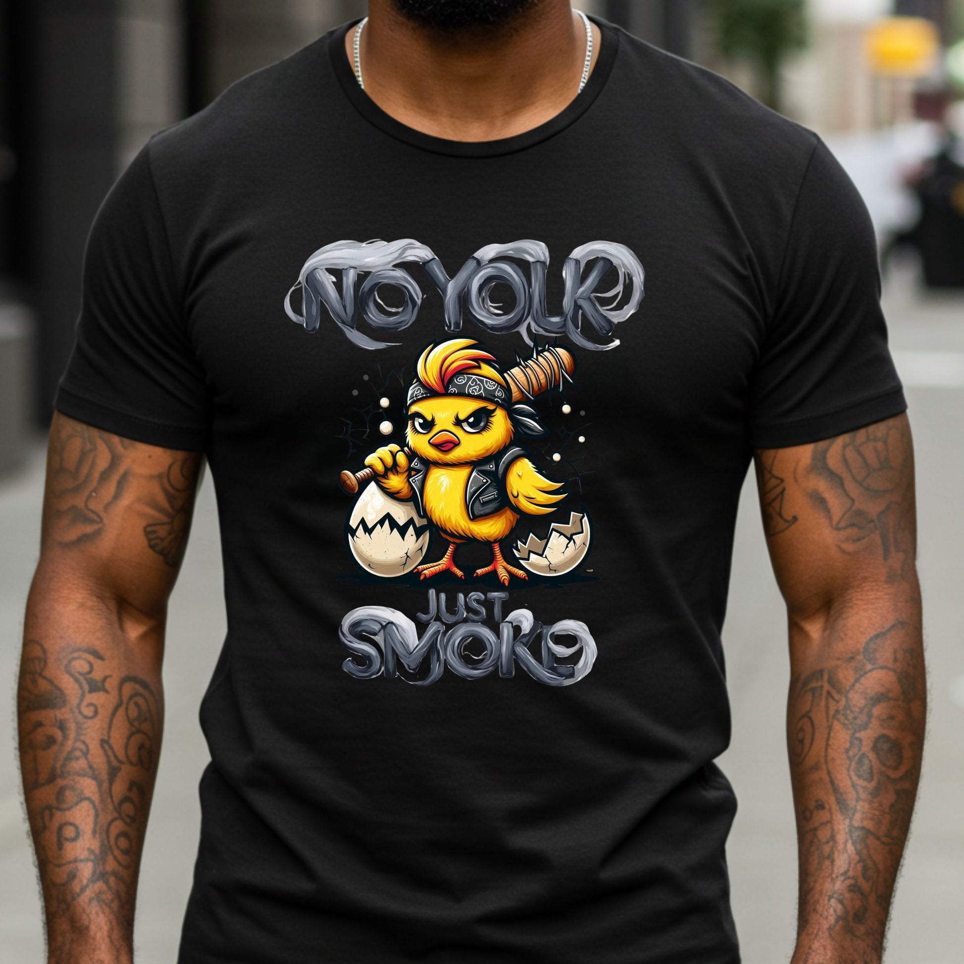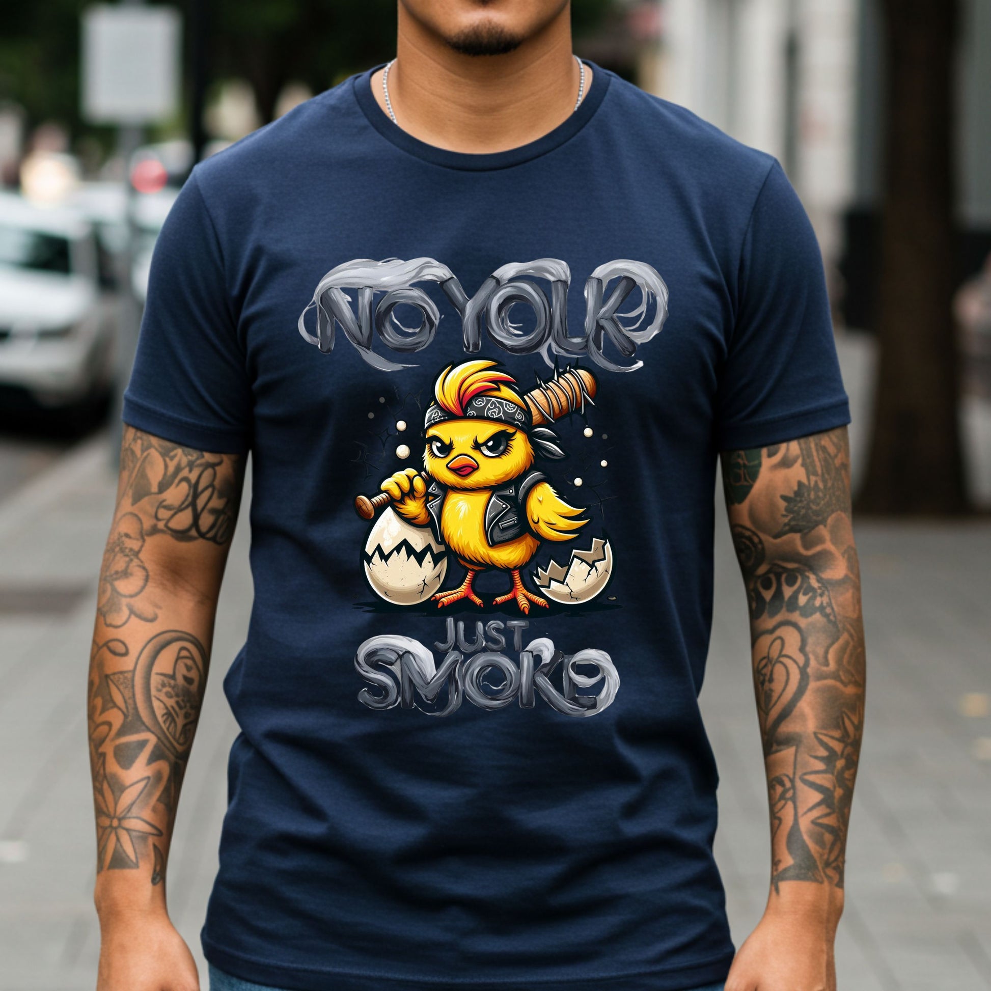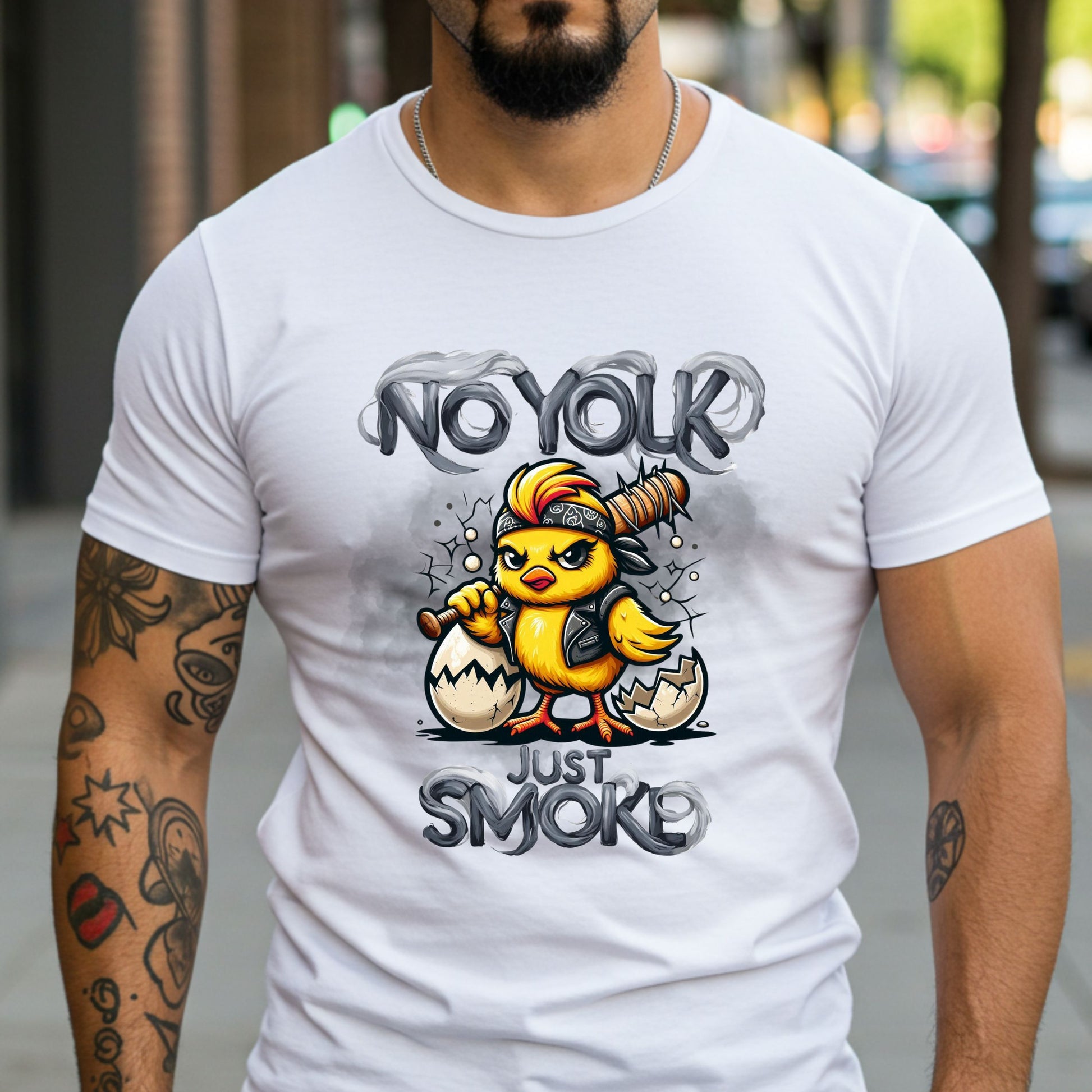 Bring the heat with this bold and hilarious "No Yolk, Just Smoke" duck shirt – perfect for the guy who doesn’t crack under pressure. Featuring a rebellious cartoon duck dressed in biker gear, freshly hatched with a bat in wing, this edgy graphic tee blends humor and attitude like no other. Whether you're a fan of witty puns, love unique shirts, or just want to flex your funny side at the gym or BBQ, this tee makes a statement loud and clear.
