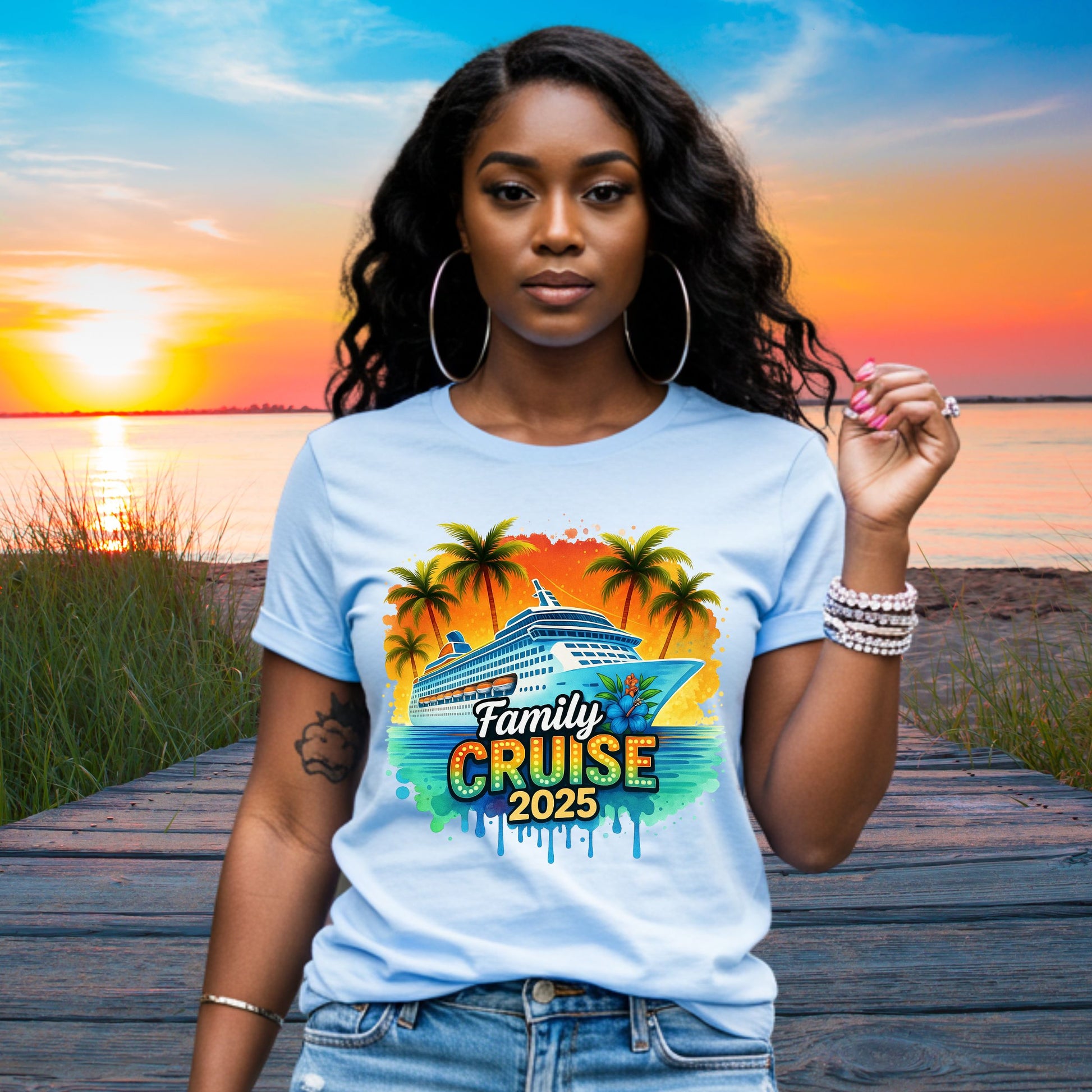 Set sail in style with this vibrant Family Cruise 2025 shirt – the perfect matching tee for your next tropical getaway! Featuring a bold cruise ship design, palm trees, and a colorful sunset splash background, this shirt is ideal for group photos, onboard fun, or exploring the islands. Whether you're planning a family reunion at sea, a group vacation, or a multigenerational adventure, this shirt brings fun and unity to your crew.