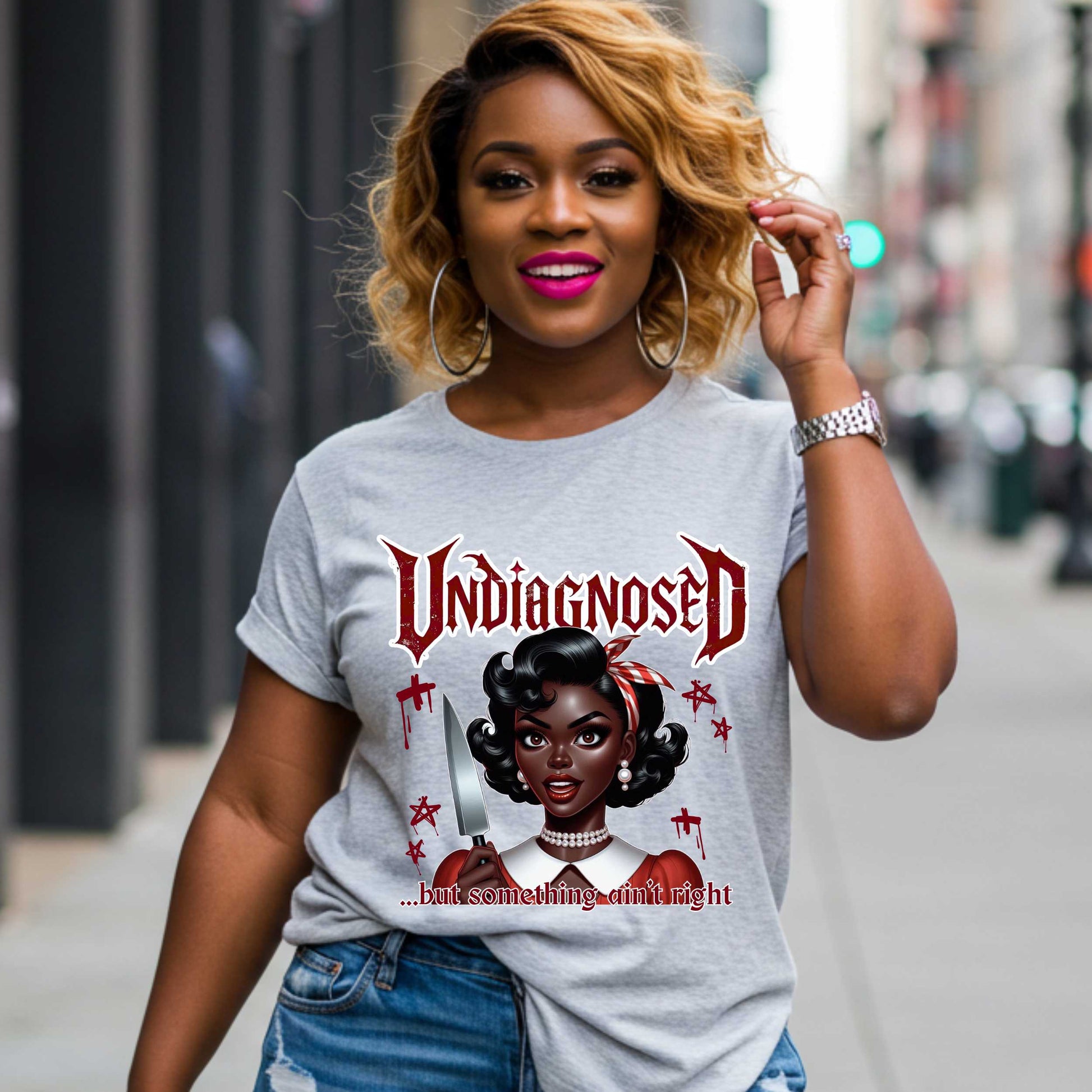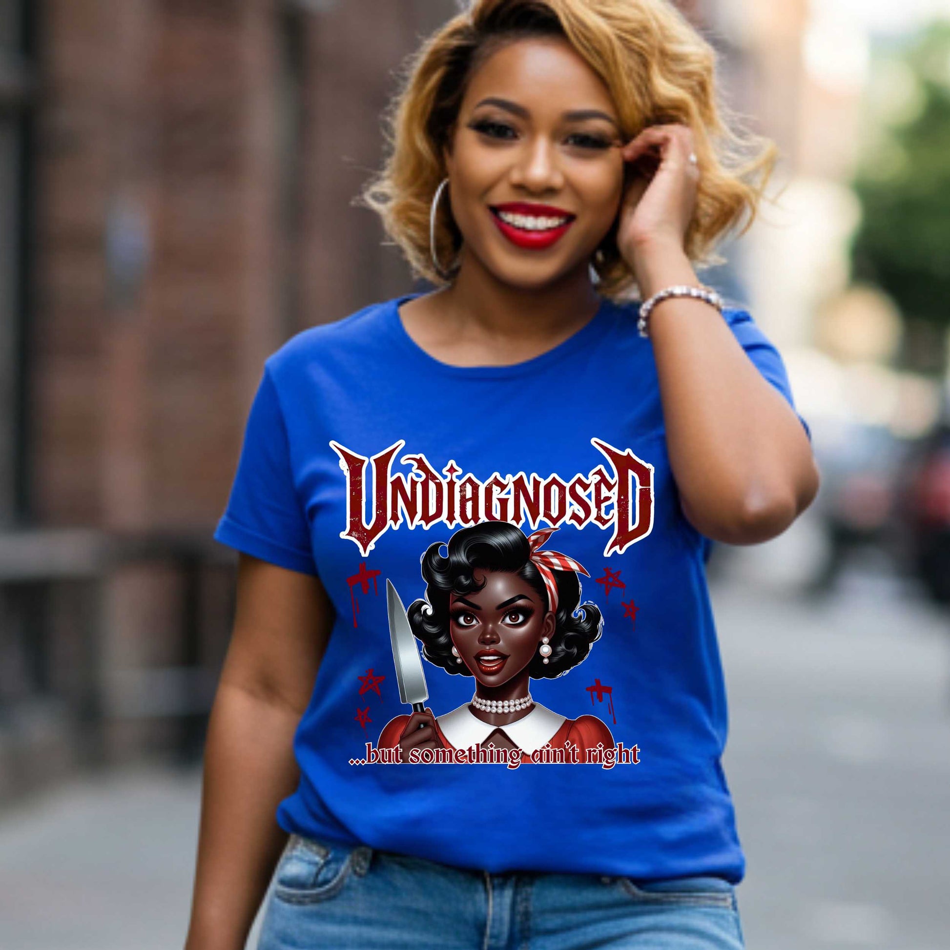 Let’s be honest—some days feel a little... undiagnosed. This hilarious and inappropriate shirt says what your inner voice has been screaming. Featuring a retro beauty with a look that says “try me,” a bold gothic-style “Undiagnosed” headline, and the biting truth: “...but something ain’t right,” this sarcastic tee is perfect for anyone whose vibe is 90% chaos and 10% coping mechanisms. Whether you’re in your healing era or just in your villain arc, this edgy joke shirt delivers dark humor with fabulous style.