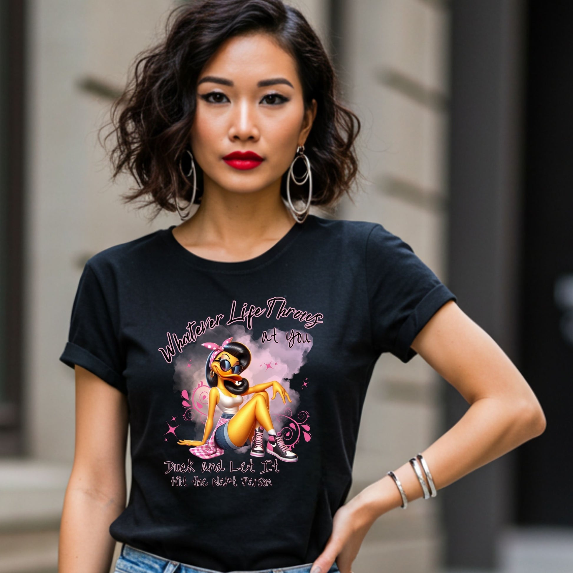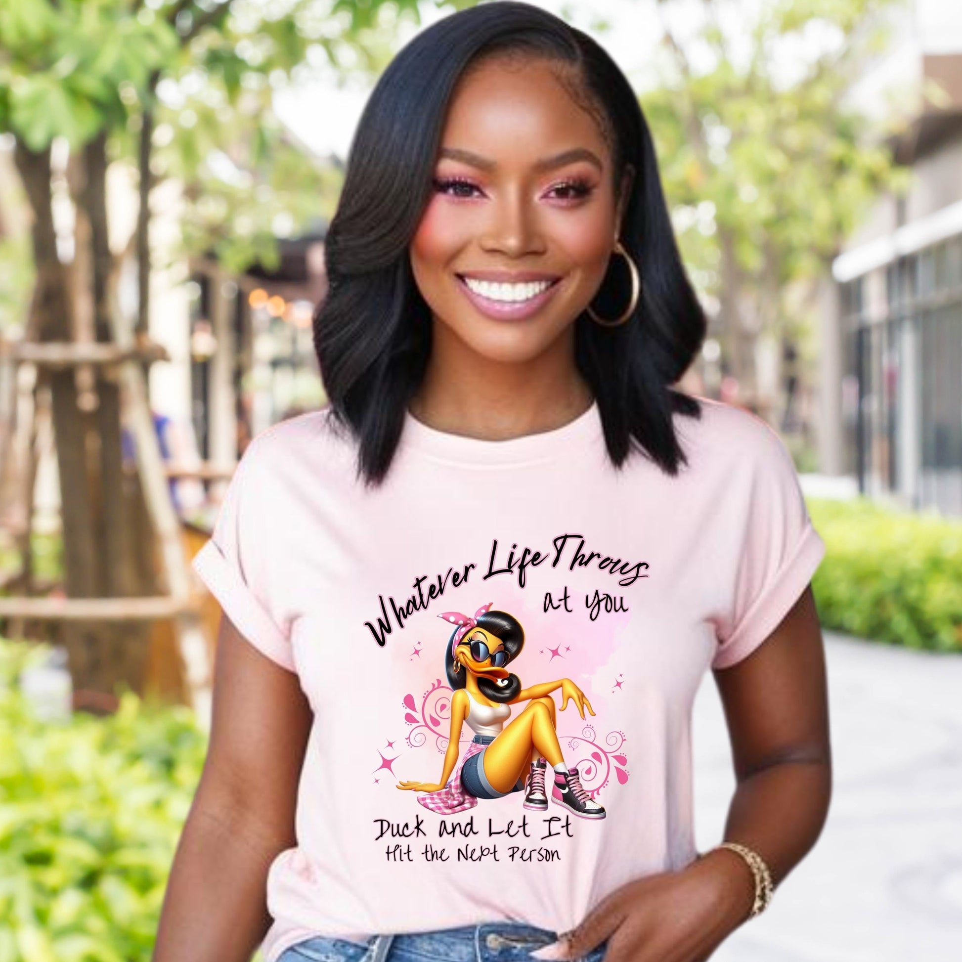When life starts throwing shade, duck and let it hit someone else—literally. This bold and sassy duck shirt delivers big attitude with a fierce cartoon duck in shades, pink kicks, and unapologetic energy. Featuring the quote: “Whatever life throws at you, duck and let it hit the next person,” this tee is perfect for anyone who meets drama with humor. Whether you’re running errands, brunching with your besties, or just vibing solo, this comfy and cheeky shirt adds a touch of sass to any outfit. Ideal for confident women who love funny graphic tees with a side of sarcasm.