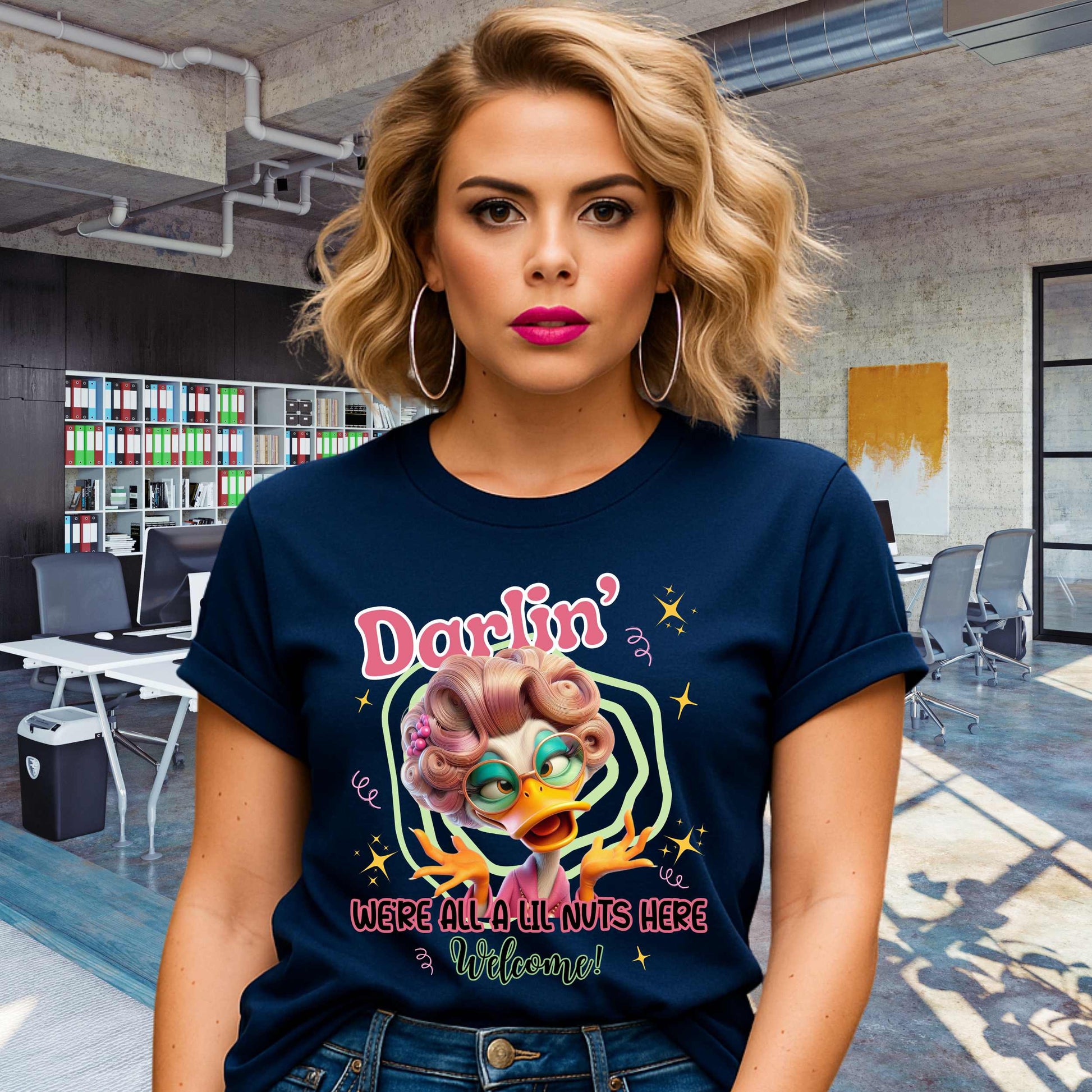 Welcome new team members with humor using this sassy and funny T-shirt featuring a cartoon and the phrase 'Darlin’, We’re All a Lil’ Nuts Here, Welcome.' Ideal for first-day icebreakers, team-building events, or quirky office culture gifts, this shirt sets the tone for workplace fun. Perfect for HR teams, coworkers, or managers looking to make onboarding less awkward and more awesome. Relevant for office parties, team events, and welcome celebrations. Product features -