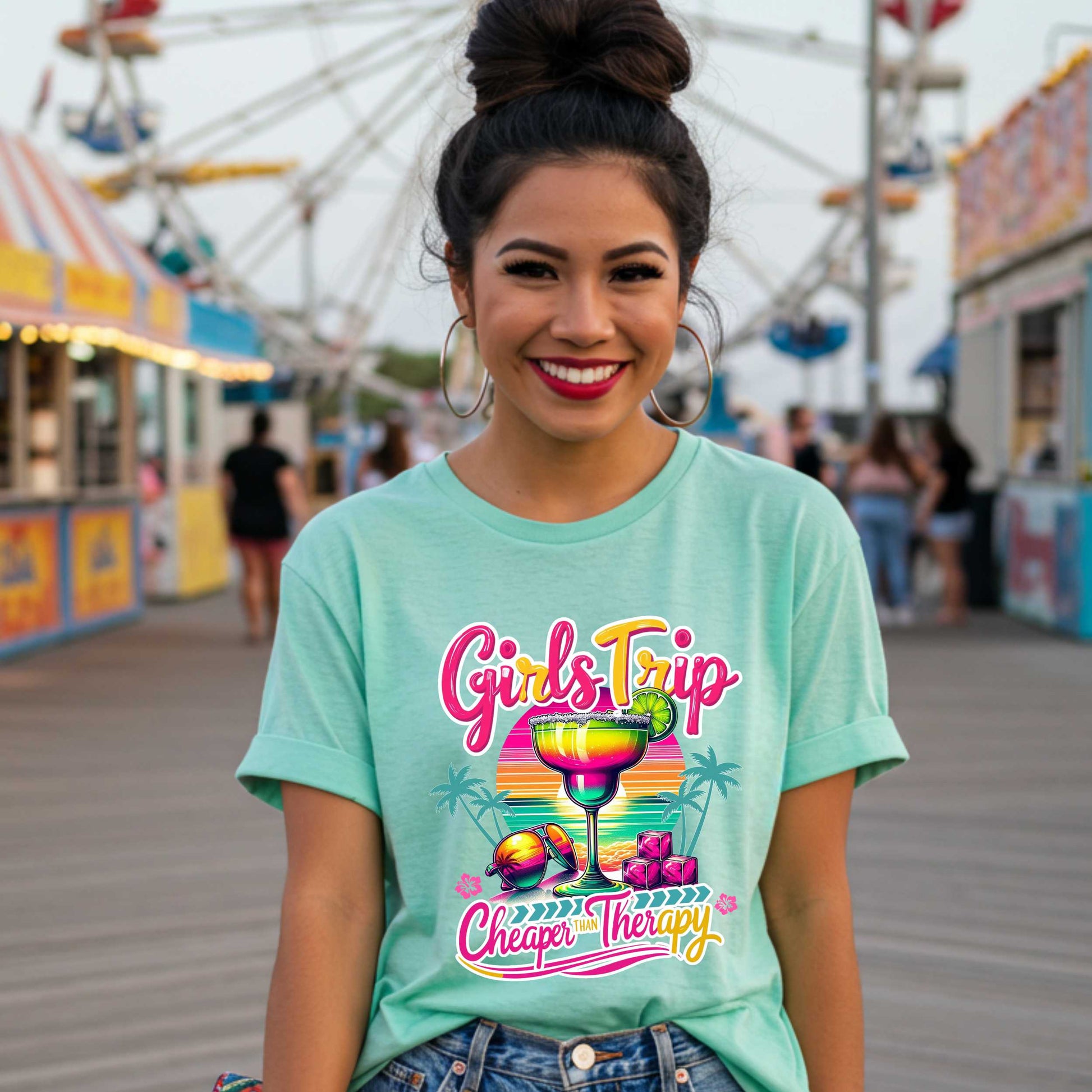 Let the world know that good times, fruity drinks, and your best girls are the only therapy you need! This colorful “Girls Trip – Cheaper Than Therapy” tee is the ultimate vacation vibe, featuring tropical cocktails, palm trees, and beachside bliss. Perfect for bachelorette weekends, birthday getaways, or just wild memories with your favorite ride-or-dies. Whether you're jetting to Cancun or sipping margs at brunch, this playful shirt makes every trip unforgettable—because let’s be real, girls trips are the cure!