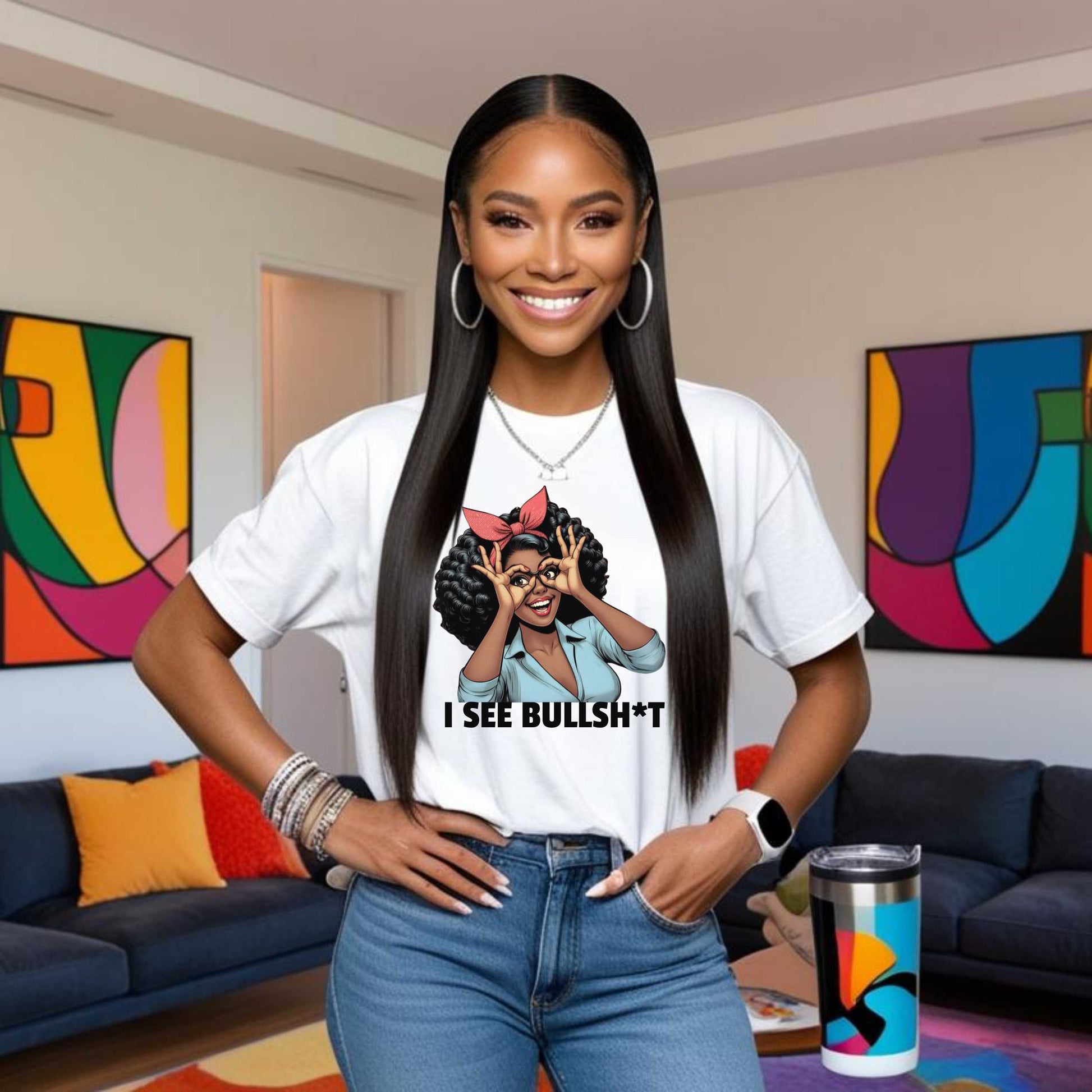 If you have a sharp eye for nonsense and aren’t afraid to call it out, this bold and hilarious graphic t-shirt is for you. Featuring a stylish cartoon woman making “glasses” with her hands and the phrase “I See Bullsh*t,” this tee is perfect for those who love a mix of sass, humor, and confidence in their wardrobe. Made to order – Available in multiple sizes. Order yours today and wear your attitude with confidence.