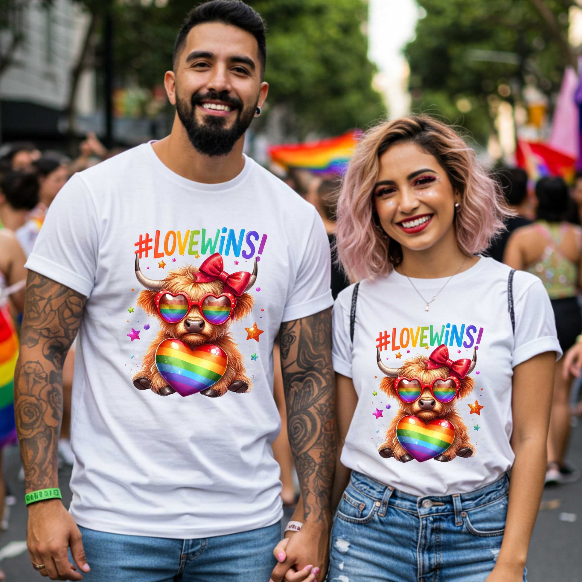 Celebrate love in all its forms with this adorable #LOVEWINS Pride shirt featuring a rainbow Highland cow, heart sunglasses, and LGBTQ+ flair. Let the world know that love always wins—with style! This adorable unisex Pride tee features a fabulous Highland cow rocking rainbow heart sunglasses, a red bow, and a big ol’ rainbow heart full of Pride.