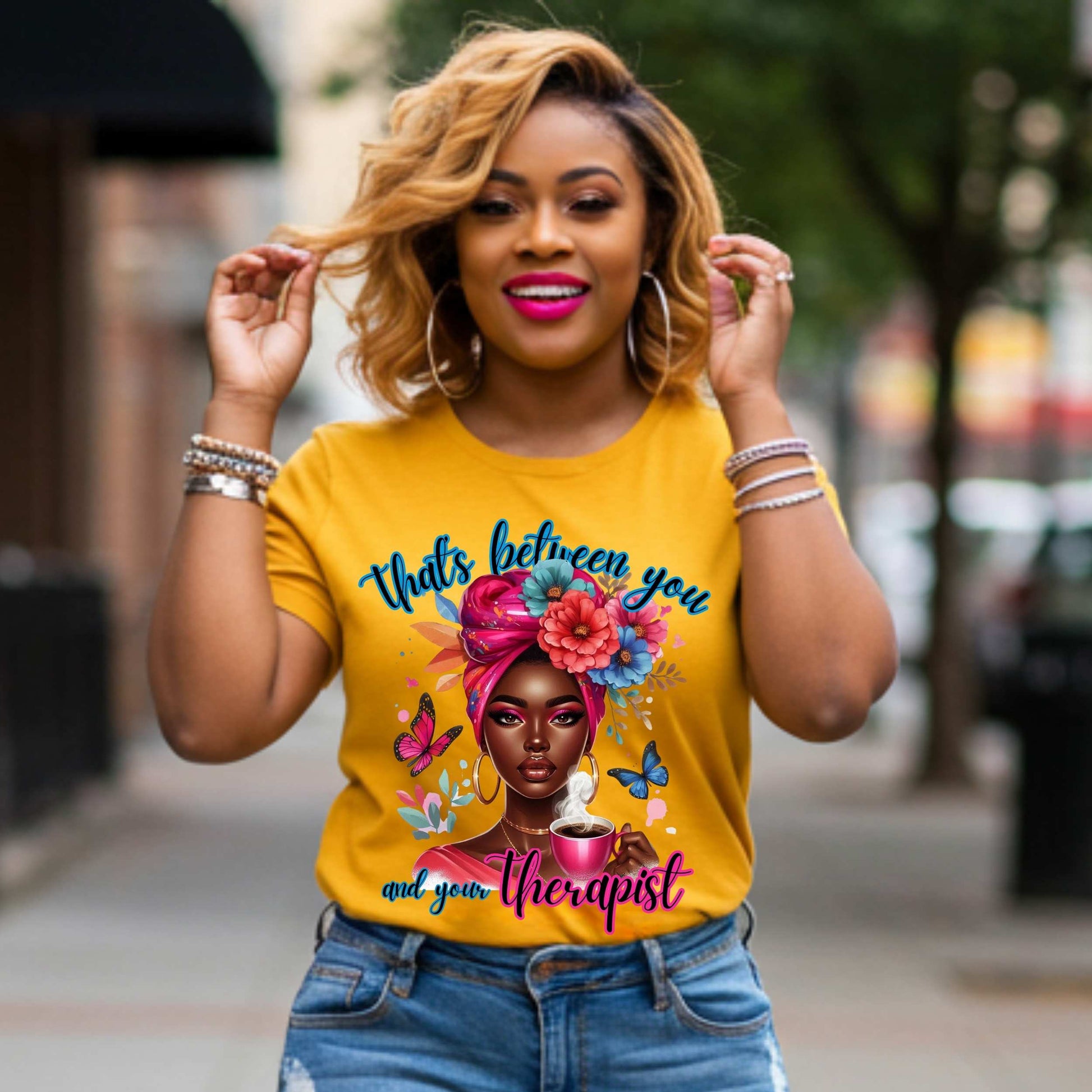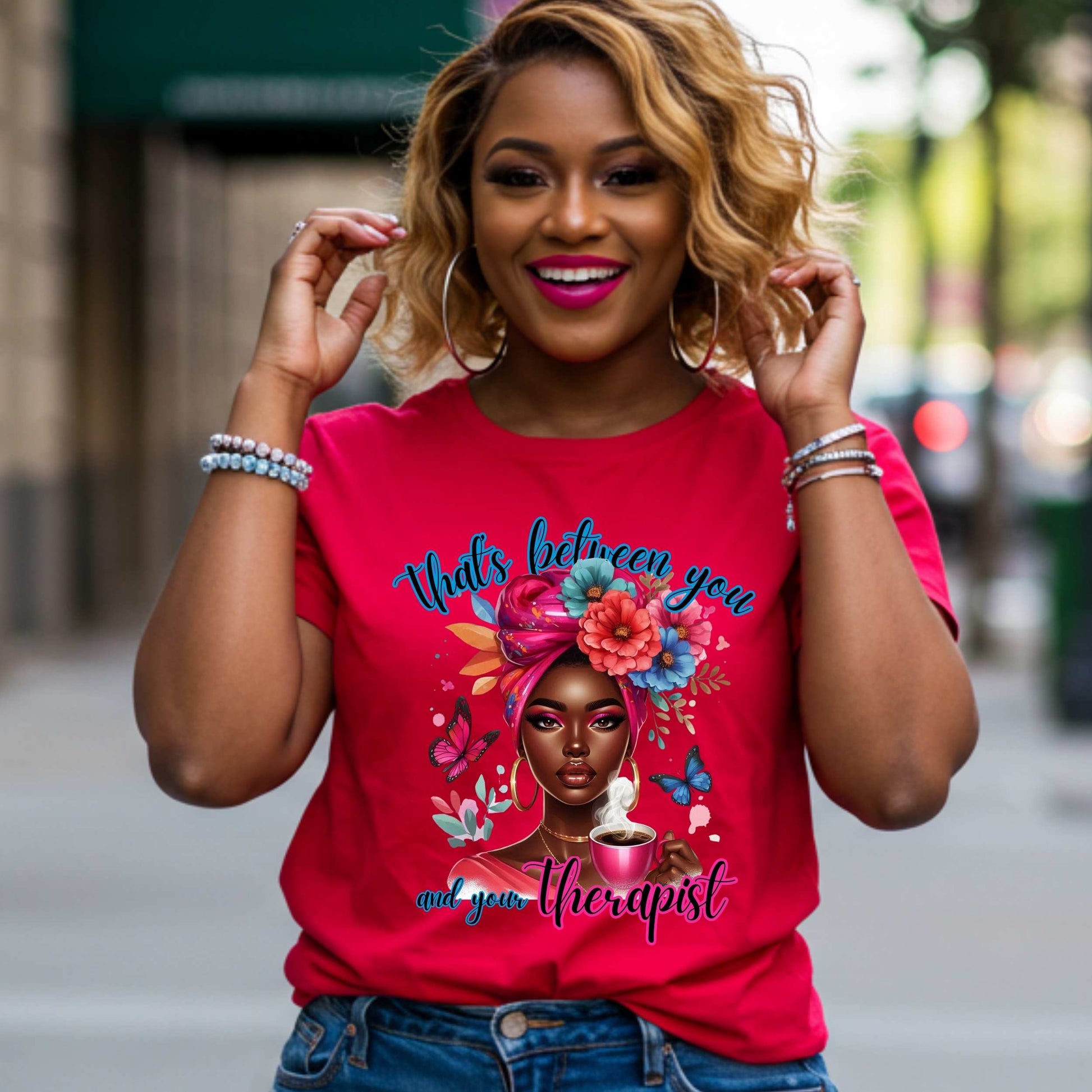 Start your day with sass and self-care in this “That’s Between You and Your Therapist” tee – the perfect mix of humor and boundaries. Whether you’re dodging drama or minding your business with iced coffee in hand, this bold and beautiful design is a whole vibe. With vibrant florals and a confident queen graphic, this Let Them-inspired shirt is ideal for those who don’t have time for nonsense and know when to pass the mic to a professional.