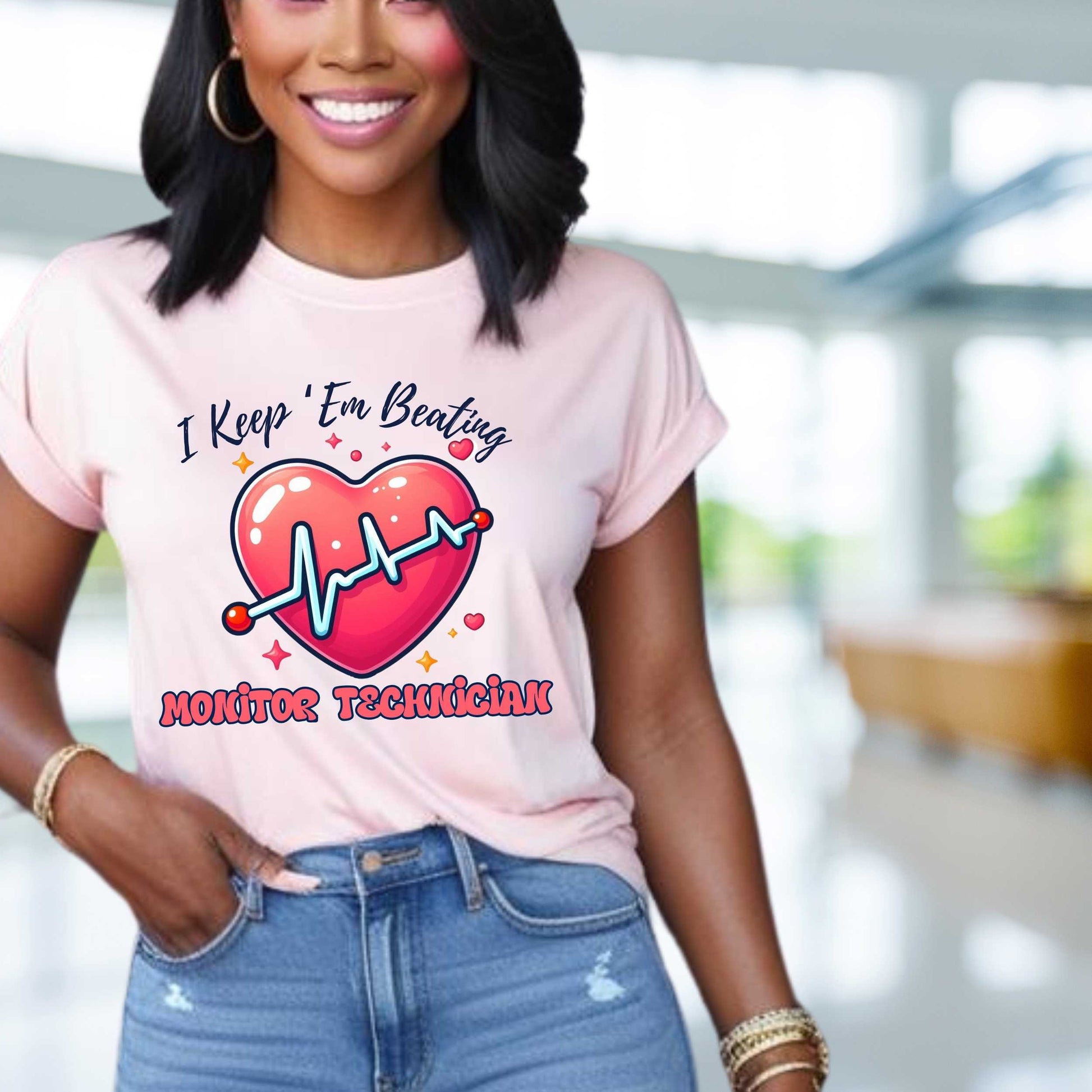 "I Keep ‘Em Beating" Monitor Technician T-Shirt Show your Monitor Technician pride with this bold and stylish EKG Tech t-shirt, designed for the dedicated professionals who keep hearts in rhythm. Featuring a vibrant heart and EKG line graphic with the phrase “I Keep ‘Em Beating”, this shirt is perfect for cardiac monitor techs, telemetry specialists, and ECG/EKG professionals who play a critical role in patient care.