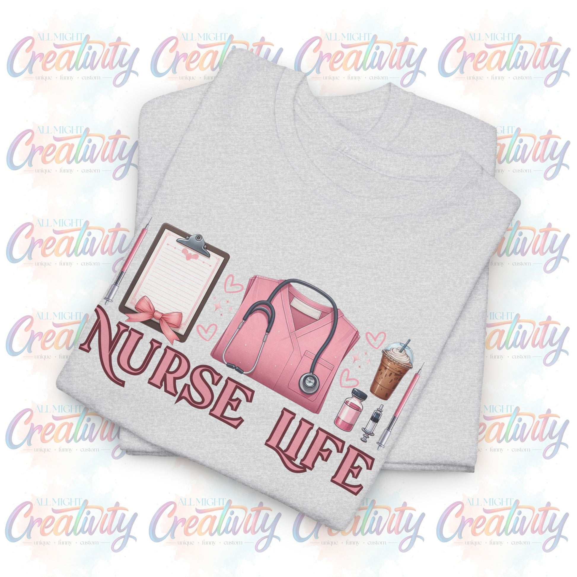 Show off your nurse pride with this adorable "Nurse Life" t-shirt, designed for hardworking nurses, RNs, LPNs, CNAs, and medical professionals who deserve to look stylish while on and off duty! Featuring a pink medical-themed design with scrubs, a stethoscope, clipboard, syringes, and an iced coffee (a nurse essential!), this tee is the perfect way to celebrate your dedication to healthcare.