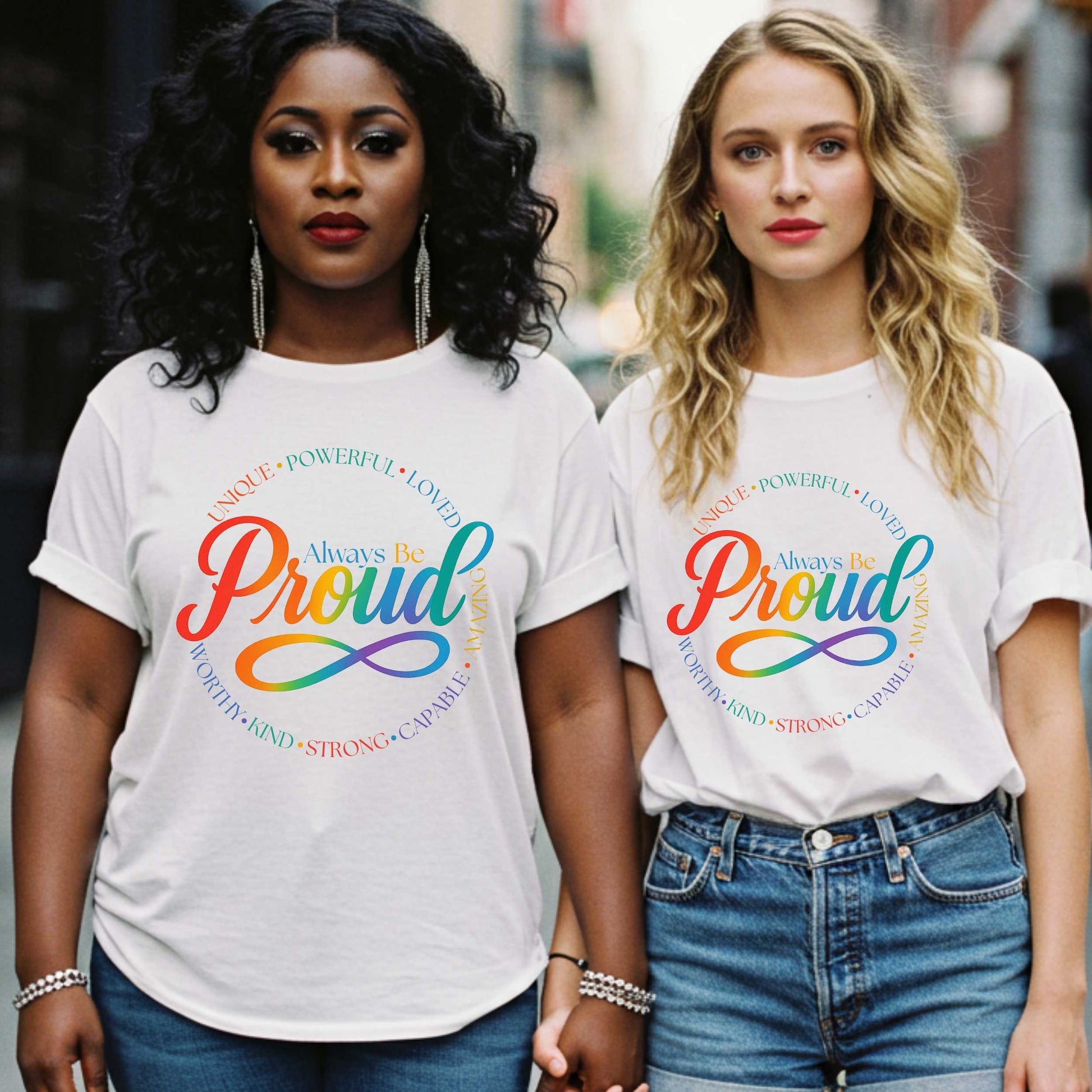 Celebrate Pride with this empowering unisex shirt—Always Be Proud in rainbow colors with affirmations for strength, love, and LGBTQ+ pride. Let your pride shine every day with this Always Be Proud unisex tee—designed to inspire, uplift, and celebrate everything that makes you powerful and unique. Featuring a vibrant rainbow script surrounded by affirmations like “Strong,” “Loved,” “Capable,” and “Amazing,” this design is a wearable reminder of resilience and self-love.