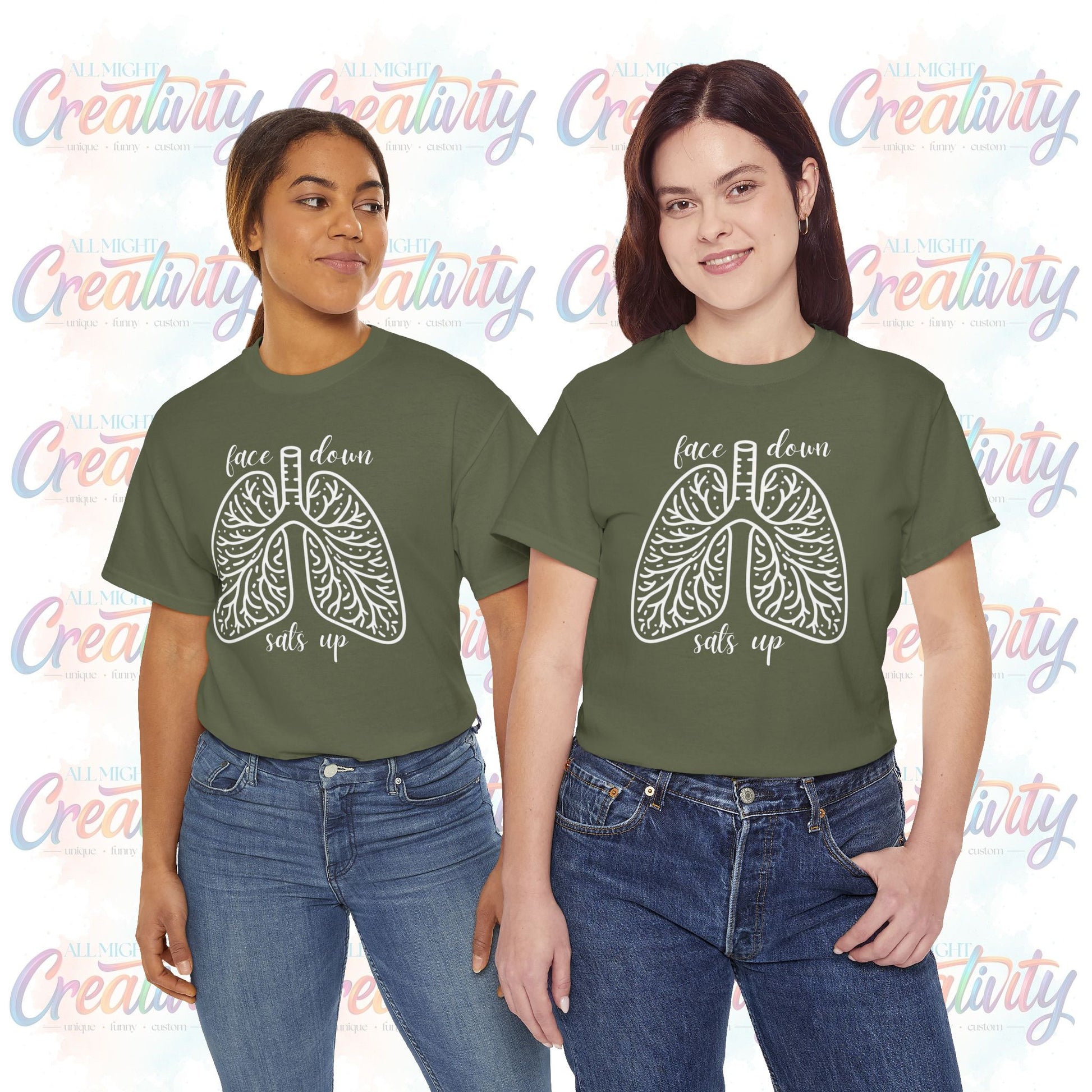 Face Down, SATS Up – Respiratory Therapist T-Shirt Breathe easy and let your style do the talking with this Respiratory Therapist T-shirt, designed for the heroes of the airway! Featuring a beautifully detailed lung design and the phrase "Face Down, SATS Up," this shirt is a perfect mix of RT humor and professional pride. Whether you're a respiratory therapist, ICU nurse, or pulmonary specialist, this tee is a must-have for those who know the power of positioning and good oxygenation.
